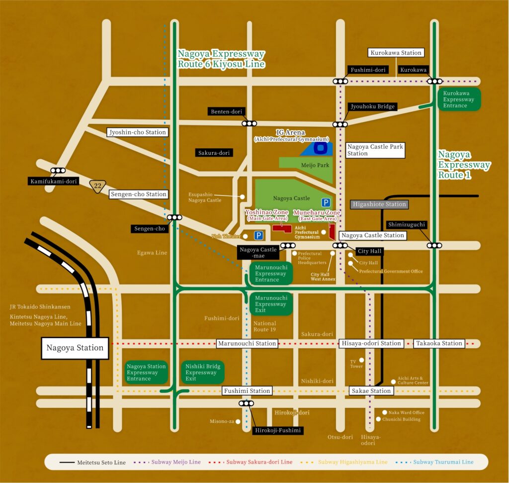 Nearest Station: Subway Meijo Line “Nagoya Castle” Station8-minute walk from Exit 7Right next to entrance 7