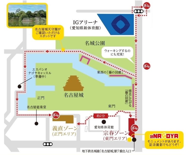 金シャチ横丁の宗春ゾーンからIGアリーナへは、徒歩で約10分の距離。