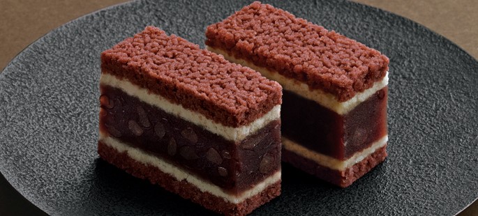 大納言小豆をたっぷり使用しているのが特徴です。白餡と小豆餡を蒸した生地で粒餡をはさむことで、断面は美しく、ほろほろとした食感のあとに粒餡の優しい甘さが広がります。