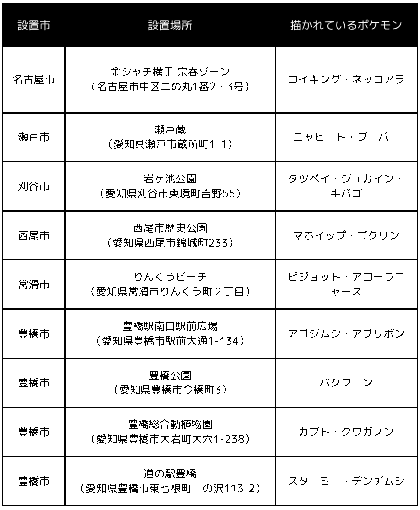 愛知県内には今回設置されたポケモンマンホール『ポケふた』が5カ所あります。また、既に設置済みのポケモンマンホール『ポケふた』が4カ所あります。ぜひ、金シャチ横丁を起点に県内各地のポケモンマンホール『ポケふた』を巡ってみてください!
